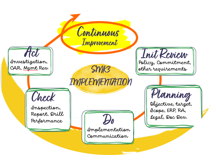 Sistem Manajemen K3 (SMK3) adalah bagian dari sistem manajemen perusahaan secara keseluruhan yang meliputi struktur organisasi, perencanaan, pelaksanaan, tanggung jawab, prosedur, proses dan sumber daya yang dibutuhkan bagi pengembangan, penerapan, pencapaian, pengkajian dan pemeliharaan kebijakan keselamatan dan kesehatan kerja dalam rangka pengendalian resiko yang berkaitan dengan kegiatan kerja guna terciptanya tempat kerja yang aman, efisien dan produktif.
